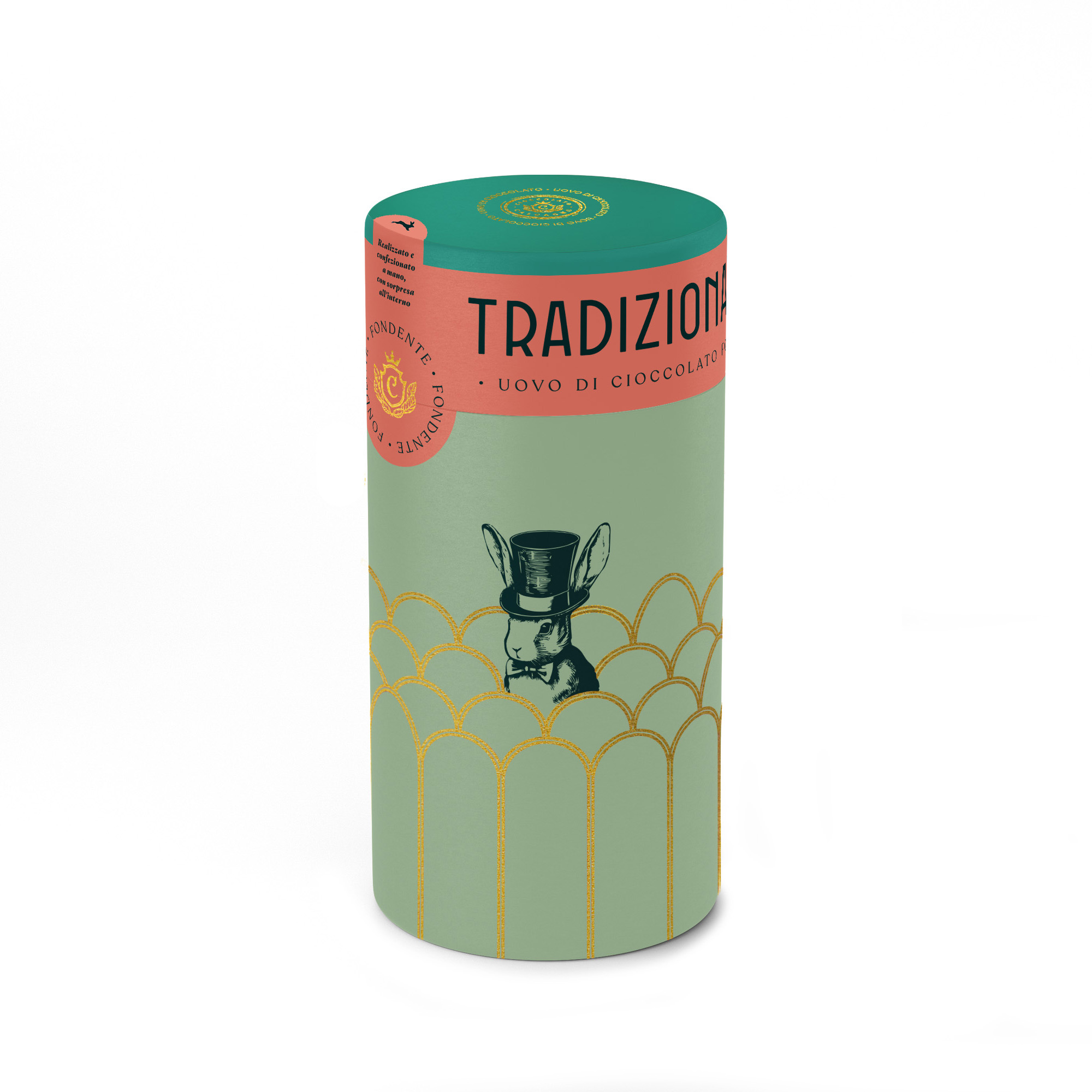 L'Uovo di Pasqua della tradizione da 300 g nelle versioni Cioccolato al Latte, Fondente, Bianco e Caramello in un’originale confezione cilindrica. Cosa starà cercando il coniglio col cappello?