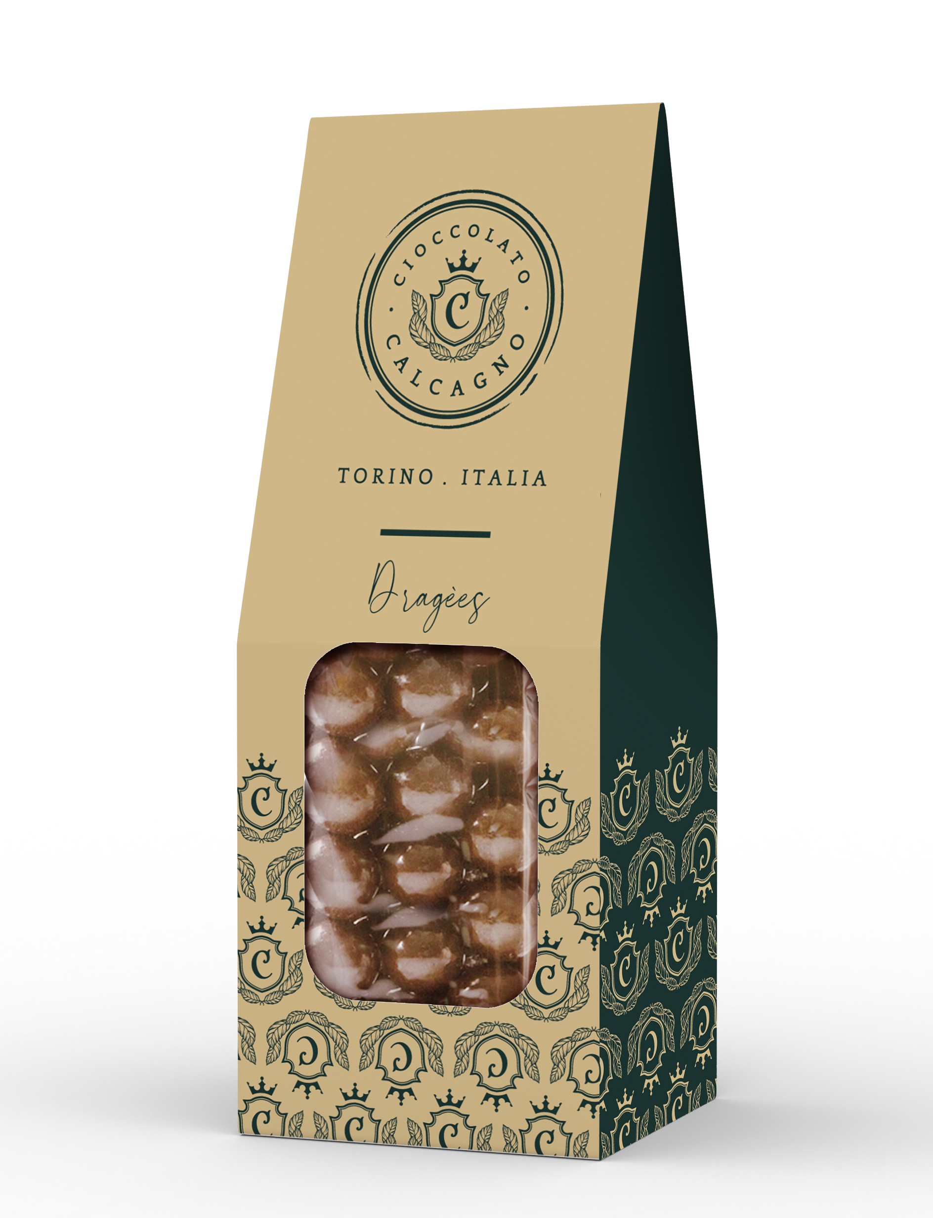 Dragées di chicchi di caffè ricoperti con cioccolato fondente in astuccio da 130 g o in sacchetto richiudibile da 200 g.