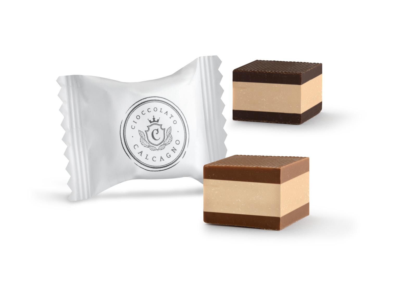 Cremini avvolti in due strati di cioccolato fondente e di cioccolato al latte in sacchetto da 250 g o 500 g.