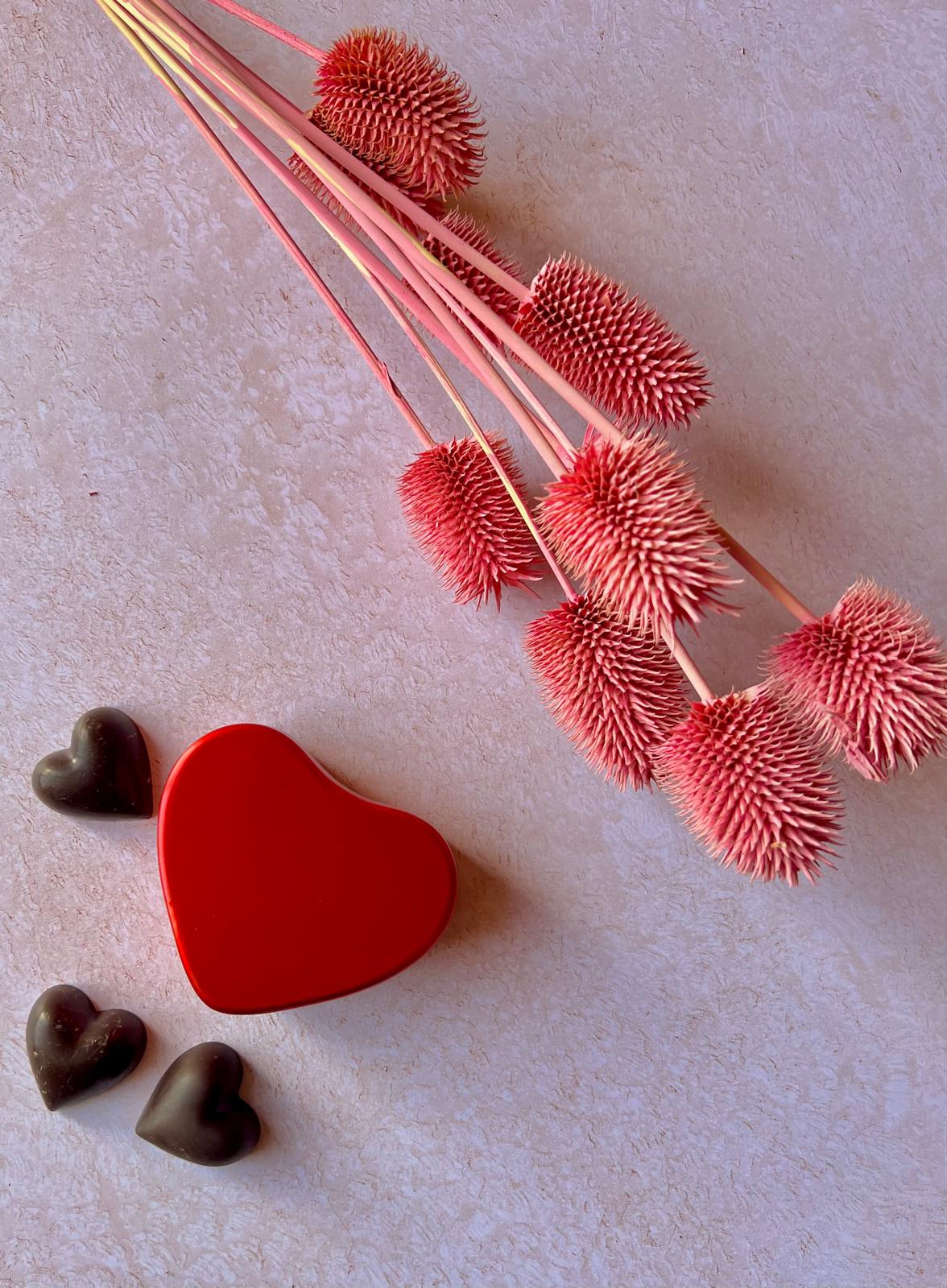 Quattro cuori di cioccolato assortiti (Cioccolato fondente, cioccolato al latte, cioccolato bianco e cioccolato al caramello salato) in una romantica scatolina rossa.
